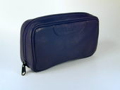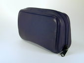 Internal comparment has slots for two pipes. Separate latex-lined vinyl tobacco pouch with zipper closure. Tobacco pouch held in place with a magnet. Enclosures for pipe tool & cleaners. Zipper closure. Black full grain leather. Length: 7.25 in./18 cm., Height: 4 in./10 cm., Width 2 in./5 cm.