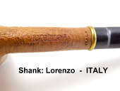 VINTAGE! UNSMOKED! Lorenzo StraightChimney - narrow bowl. Natural Sandblast. Round shank. Flat bottom sitter. Vulcanite stem with regular tenon and gold-colored ring trim. Stamping: Lorenzo - Italy. Stem Stamp: "L". Lorenzo logo sleeve included.