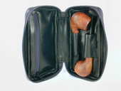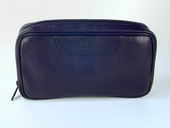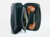 Internal comparment has slots for two pipes. Separate latex-lined vinyl tobacco pouch with zipper closure. Tobacco pouch held in place with a magnet. Enclosures for pipe tool & cleaners. Zipper closure. Black full grain leather. Length: 7.25 in./18 cm., Height: 4 in./10 cm., Width 2 in./5 cm.
