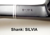 VINTAGE: Lorenzo - SILVIA - Half- bent Brandy with double banded stem trim from Lorenzo Briar. Diamond shank. Plexi stem with 9 mm. filter chamber. Removable adapter / insert included. Unsmoked. Shank: Lorenzo , SILVIA. No stamped on the stem. Lorenzo logo cloth pipe sleeve included.