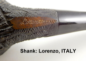Vintage! UNSMOKED! Lorenzo Squat Pot - Black Rusticated. Round shank. Vulcanite stem with regular tenon. Stamping: Lorenzo - Italy. Lorenzo logo sleeve included.