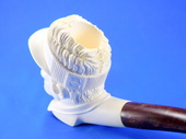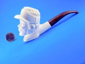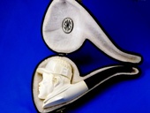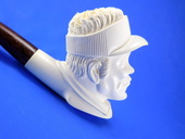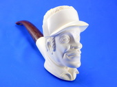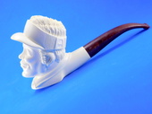 PRIVATE COLLECTION: GOLFER by Master carver Etem. Rare subject! Golfer wearing a classic sun hat ready to tee off. An unusual theme for your pipe collection. Extra-deep bowl. Turkish Bakelite stem. Custom-fitted velvet-lined SMS logo case.