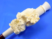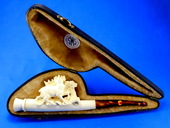 Two ways to smoke! Use the insert for cigarettes or remove the insert for a cheroot. Beeswax finish. Bakelite stem. Super light-weight Block Meerschaum. Custom-fitted velvet-lined SMS logo case.