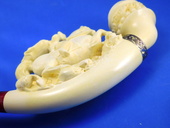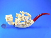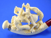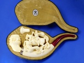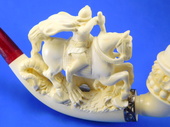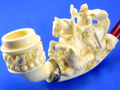 The carving of the legendary St. George slaying the dragon. Detailed carvings is outstnding. Decorated with a Sterling Silver ferrule. Two interchangable bowls are included for pipe tobacco and charoot or cigarette holders! Custom-fitted velvet-lined case included.