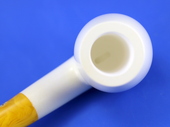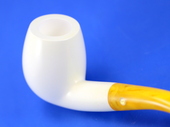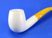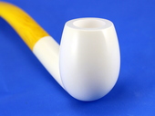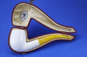 BENT BILLIARD - Half-bent smooth billiard. Extra large & deep bowl. Turkish Bakelite yellow-swirl tapered stem. Custom-fitted velvet-lined SMS logo case protects the beauty of the pipe.